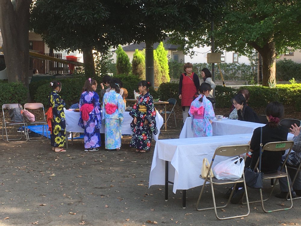 今年は、例年自治会館で行っているお茶会を山見公園で「野点」という形で行いました。かわいい子供たちがお給仕を行い世代間の交流も図れる良い機会となりました。