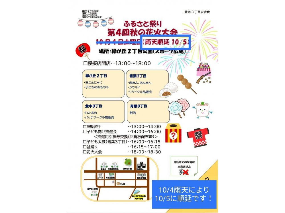 本日、緑が丘2丁目公園で予定していました、『ふるさと祭り』は雨天のため10月5日(日)に延期となりました。