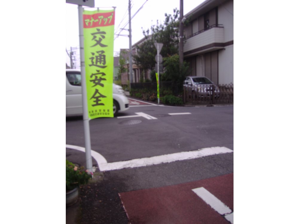 先日当地区で交通事故が発生し小学生がけがを負いました。ここ数年この地区では車の通行量が増加していて心配していた矢先でした。自治会定例会でも話題になり早速交通安全協会の方に相談したところ、地区内の数カ所に交通安全の旗を設置していただきました。ありがとうございます。